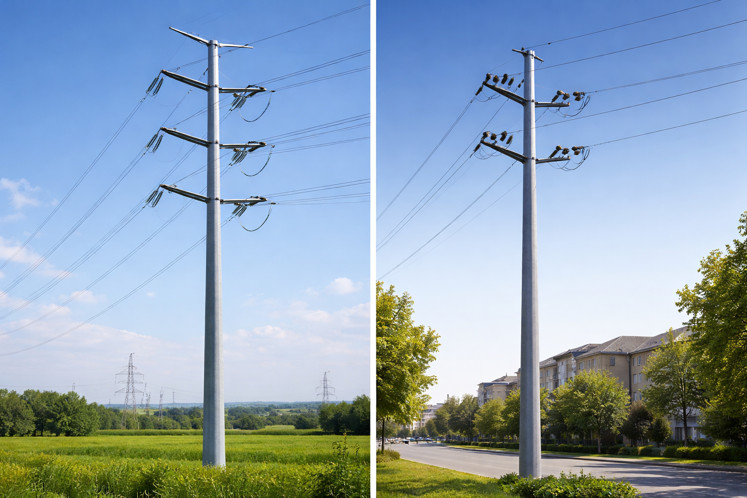 | Structure Height | Generally taller to ensure adequate ground clearance and safety for high-voltage transmission lines. | Typically shorter, making them well-suited for urban streets and industrial zones. |